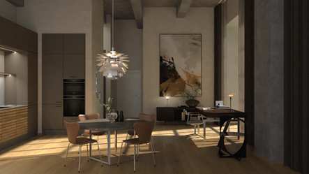 Ved at tilføre varmere farvetoner, taktile tekstiler og naturlige materialer skabte vi en kontrast til de industrielle overflader. Resultatet er et leverum, hvor det rå og det indbydende mødes – et rum med kant, men også med varme og ro.
